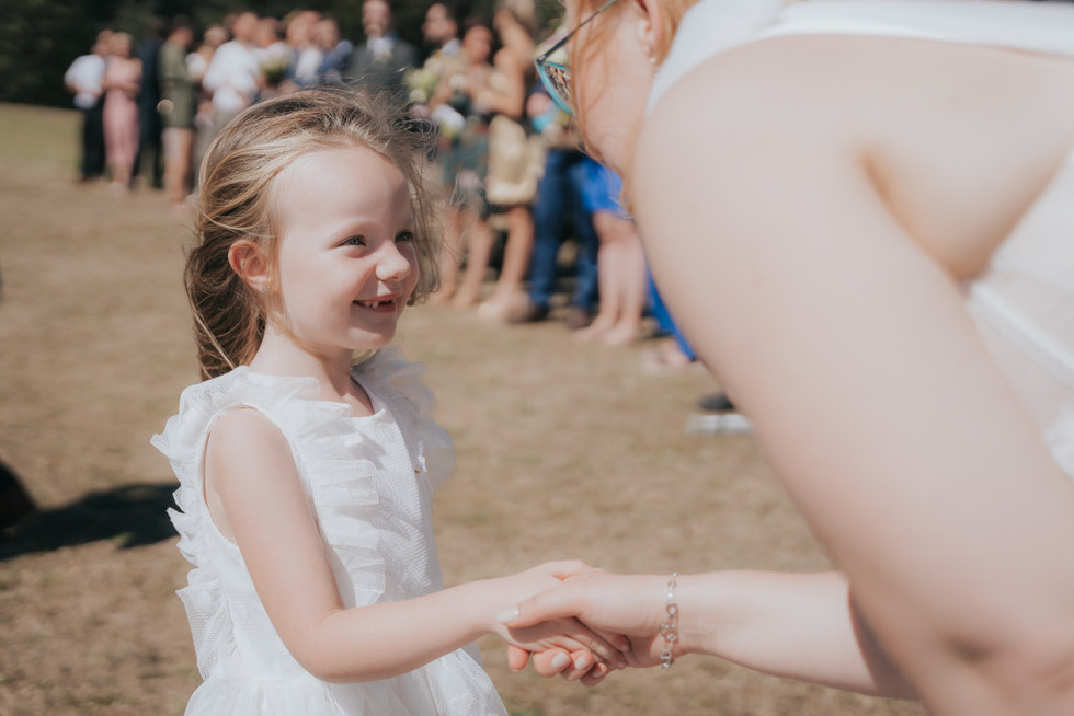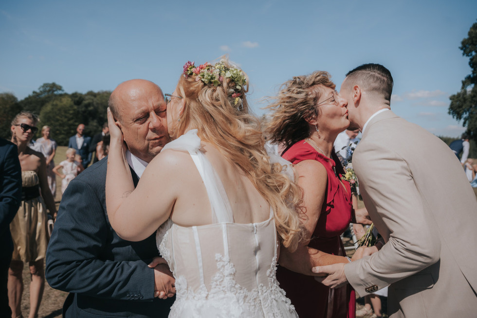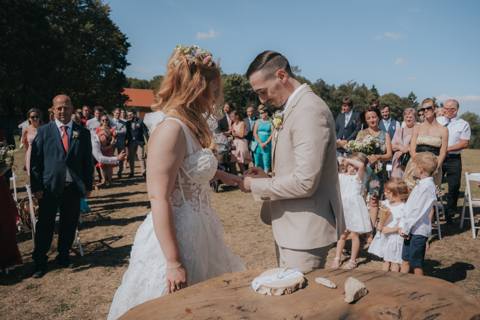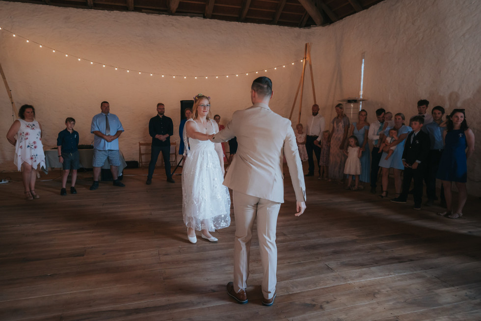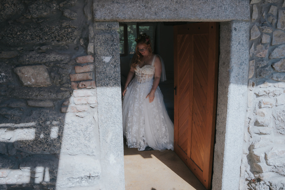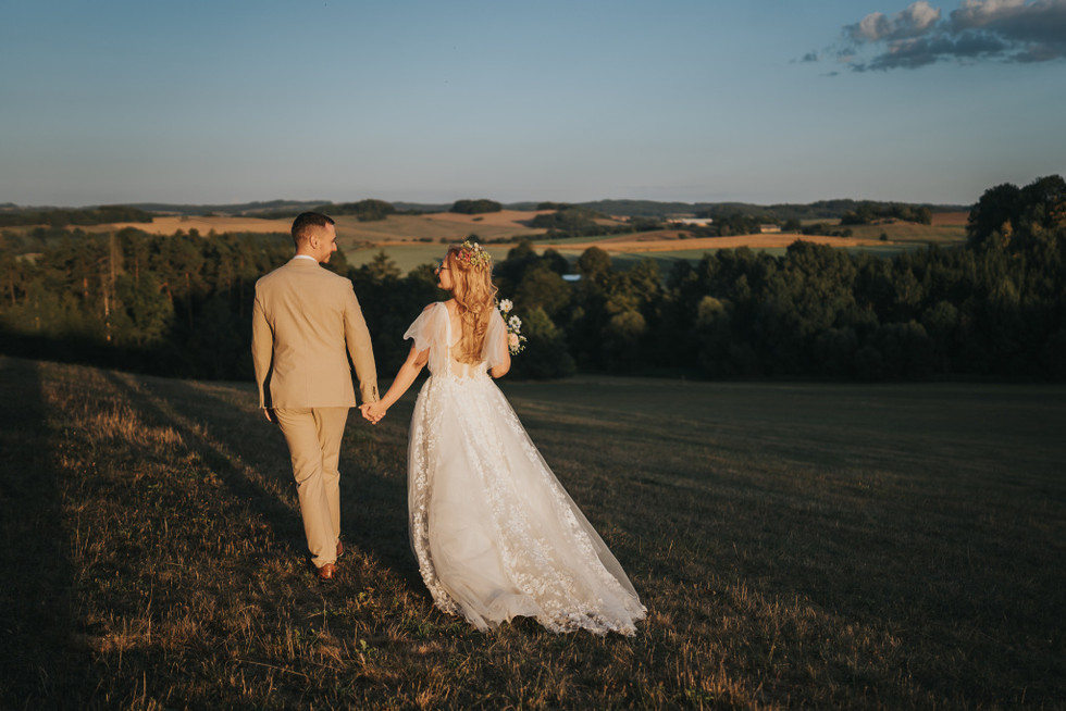 Svatební den měl i nečekaný zvrat v podobě dvou svatebních obřadů – první proběhl v komorní atmosféře u nového domečku novomanželů, kde si řekli “ano” se svědky. Druhý obřad, už slavnostnější a dojemnější, se odehrál na krásné louce u statku s výhledem do přírody, ze kterého byste si sedli na zadek. Ceremoniál vedli sourozenci a povedlo se jim to naprosto skvěle – osobní, dojemné, a přitom vtipné přesně tak akorát.