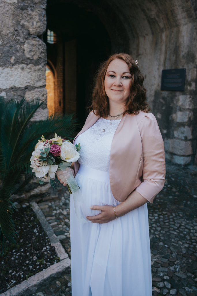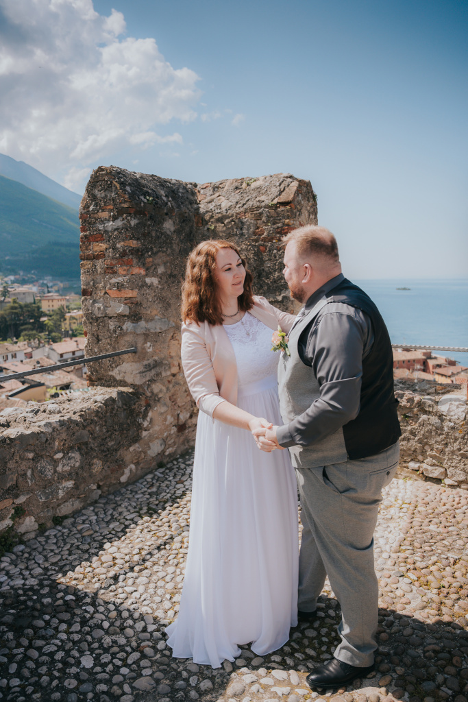 Fotit svatbu Petry a Martina v kouzelném italském městečku Malcesine u jezera Lago di Garda byl pro mě sen. To místo mě okouzlilo ještě dlouho předtím než jsem se tam vydala za focením. Obřad se konal na místním hradě s dechberoucím výhledem na jezero i městečko pod ním. I když byl veden italsky, s pomocí tlumočnice probíhal velmi podobně jako svatby u nás a podržte se, byl i stejně dojemný (já jsem stará plačka, je mi jedno, jestli oddávající mluví třeba italsky, prostě doják to byl i tak). Přítomni byli jen novomanželé a jejich rodiče, pianista doprovázel celý obřad jemnou hudbou, což dodalo celé události krásně komorní, intimní atmosféru. Počasí nám přálo – možná až moc, protože ač teploměr ukazoval příjemných 23, tak moje i ženichovo čelo svědčí o opaku. Já jsem byla ještě několik dní po svatbě červená jak humr.😄