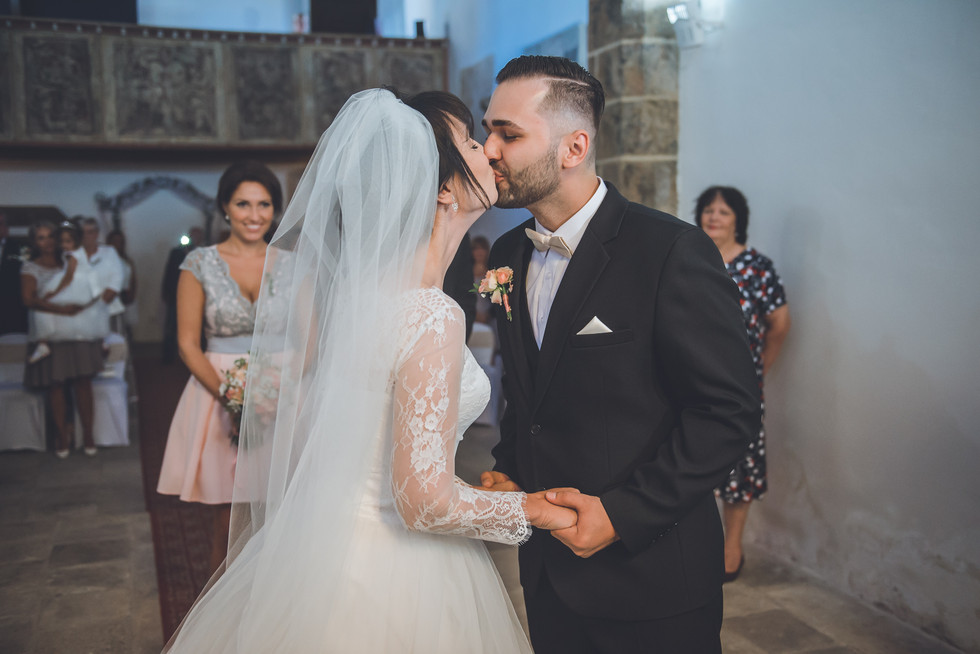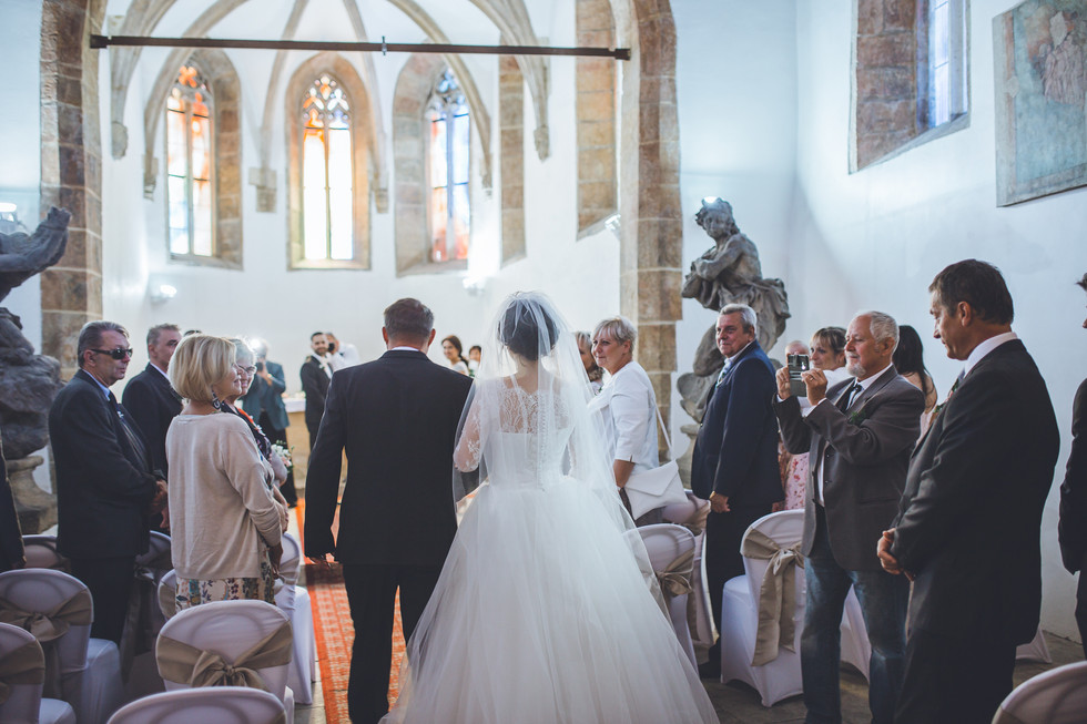 OBŘAD PROBÍHAL V HISTORICKÉ KAPLI U SVATÉHO DUCHA, KTERÁ JE POKLÁDÁNA ZA NEJSTARŠÍ PAMÁTKU V MOSTĚ. MY JSME TAM FOTILI POPRVÉ A BYLI JSME PŘEKVAPENI INTIMNÍ ATMOSFÉROU TOHOTO MÍSTA. PRO MENŠÍ SVATBU, JAKO BYLA TATO, SE TO NÁRAMNĚ HODILO. OBŘAD BYL DOJÁK I PRO NÁS, NECHCI MLUVIT ZA HONZU, ALE JÁ SE MUSELA HODNĚ DRŽET, ABYCH SE NEROZBREČELA SPOLEČNĚ S HOSTY A NOVOMANŽELI, PROTOŽE TO BYLO PROSTĚ KRÁSNÉ A NA PÉTĚ I DAVIDOVI BYLO FAKT VIDĚT, JAK SE MAJÍ STRAŠNĚ RÁDI A BEROU TO VÁŽNĚ.